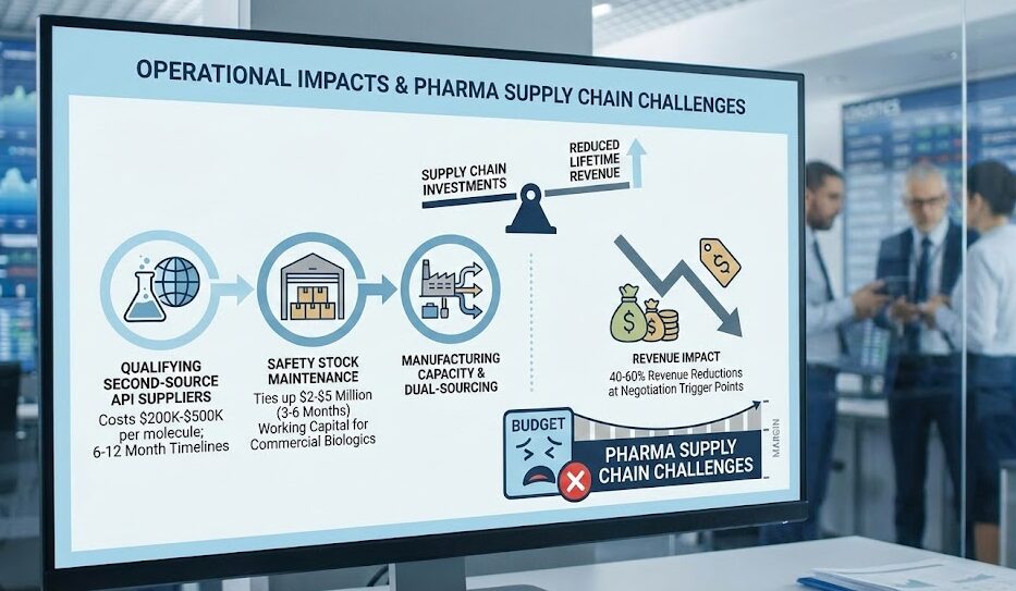 The IRA’s industry impact manifests across multiple operational dimensions. Manufacturers must recalibrate capital allocation decisions, weighing investments in dual-sourcing strategies, safety stock expansion, and manufacturing capacity against reduced product lifetime revenue projections. The compressed margin environment creates particular pressure on supply chain budgets, presenting significant pharma supply chain challenges: