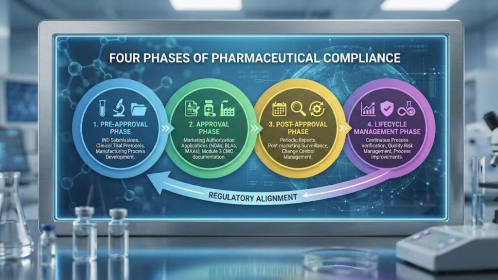 Managing regulatory compliance in pharmaceuticals follows a structured lifecycle with four distinct phases.